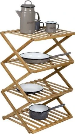 Een stevige en compacte legkast. Gemaakt van bamboe en door de scharnieren snel en eenvoudig in te klappen. Beschikt over 4 legplanken voor het opbergen van spullen. Kan worden gebruikt als schoenenrek of voor het opbergen van andere artikelen. Ideaal voor in de tent, maar ook voor thuis in de badkamer of op het balkon.